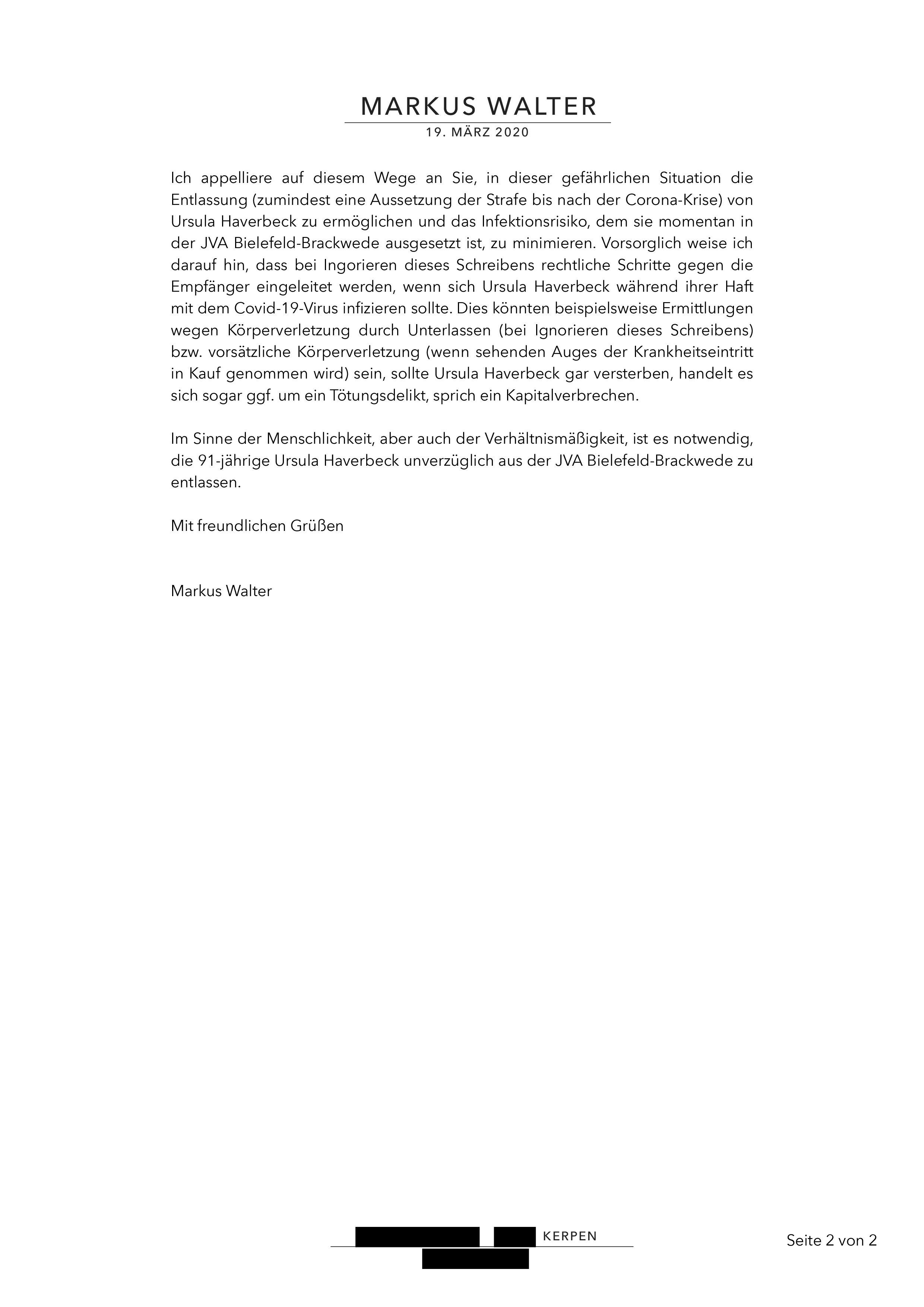 Ich stimme dem Antrag des Markus Walter auf Grund der veränderten Gesamtsituation zu und beantrage ebenfalls schnellstmögliche Entlassung aus einer — wie ich meine — unverdienten Gefängnisstrafe.